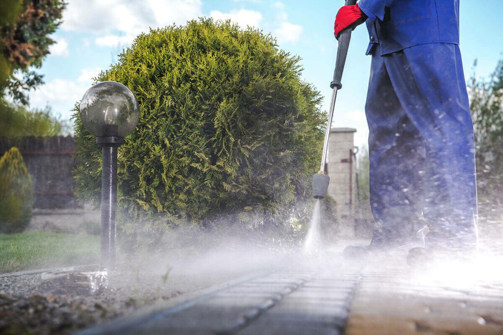 Pressure washing uses a machine to increase the pressure from a standard water hose. The pressurized water blasts away dirt and materials from many surfaces, especially concrete, bricks and patios, driveways, and more.